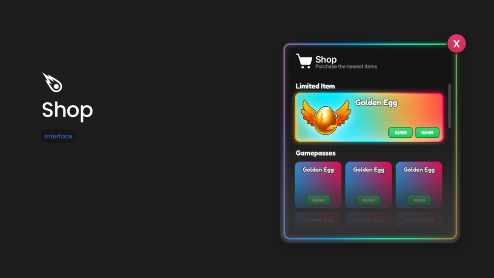 This Shop UI includes a large panel frame for the Limited/Exclusive featured item in your game, and following that, a Grid Layout for your gamepass templates. Also includes a navigation panel on the side with some visually amazing buttons.