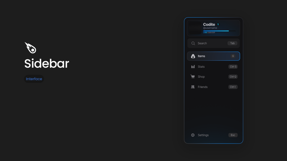 This Sidebar includes a full navigation-list, with active and inactive variants, a search bar with shortcut indicator, full profile section display, all designed with beautiful visual aesthetics.