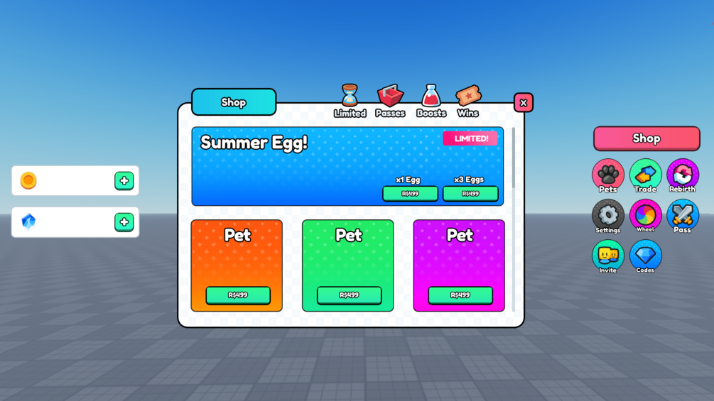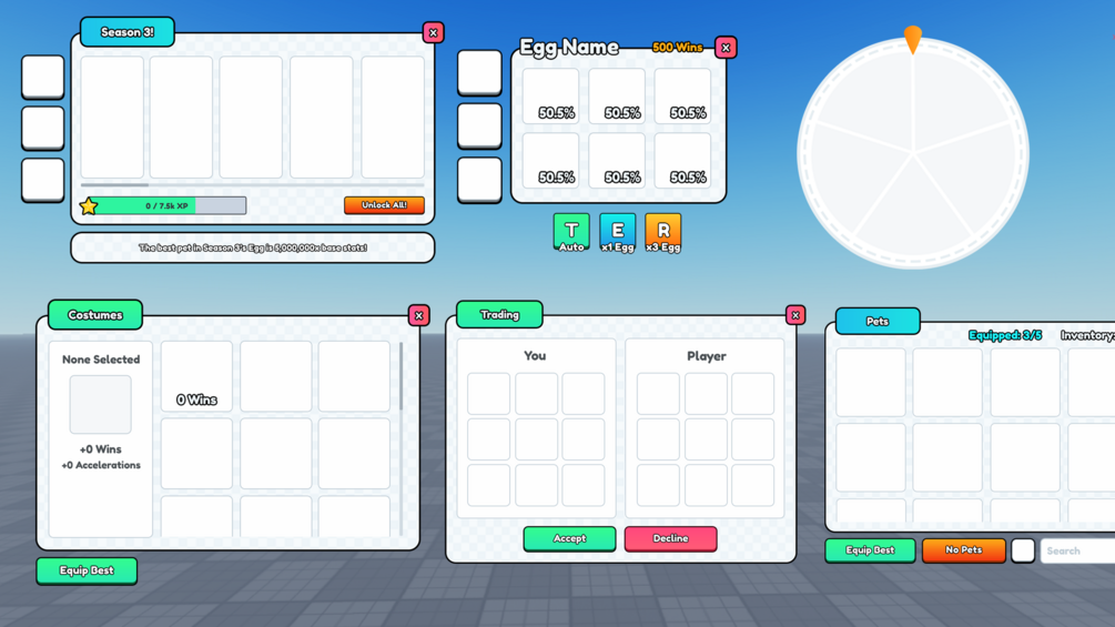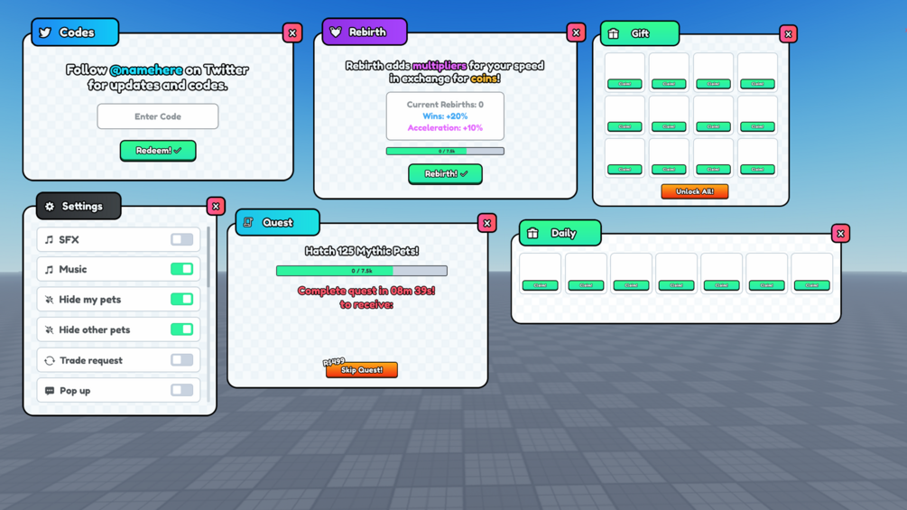 Codes, Daily, Reward, Egg, Gift, GiftList, HUD, Pets, Quest, Rebirth, TradeView, Seasonal Pass, Settings, Shop, TradeList, Spin WheelFrequently asked questions