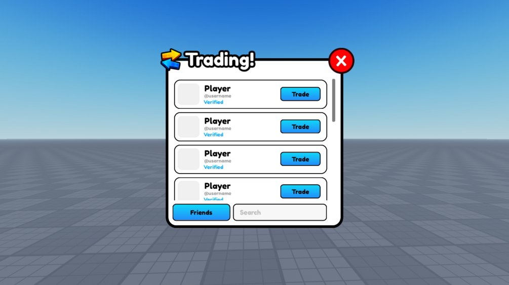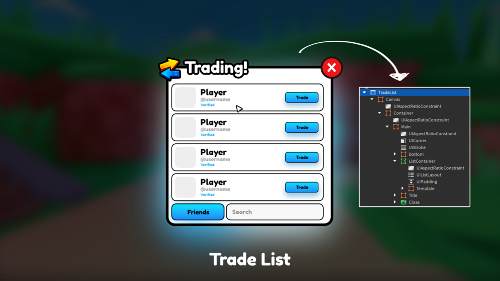 This trading interface features 4 key frames: Trade List, Trade Request, Trade Sent, and Trade Viewer
